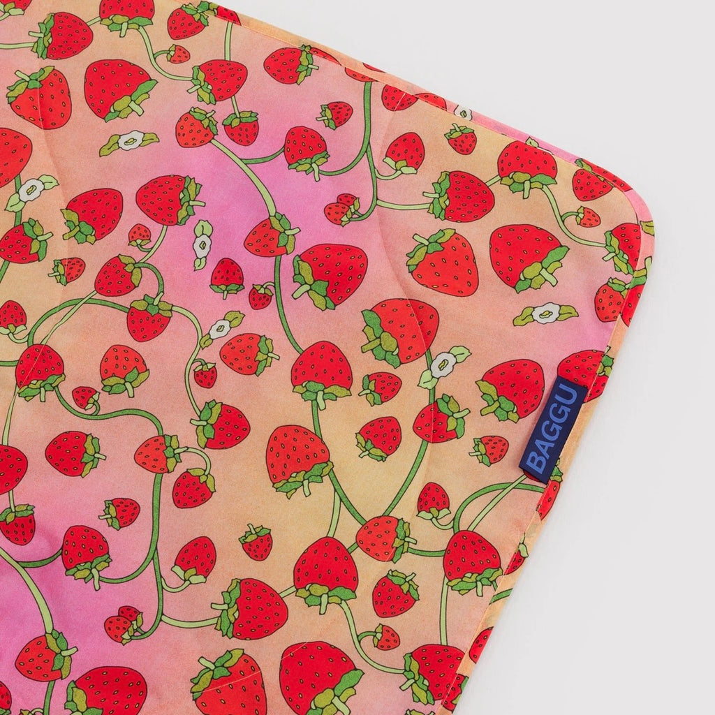 A quilted ripstop picnic blanket with carrying strap so you can roll it up and bring it anywhere.