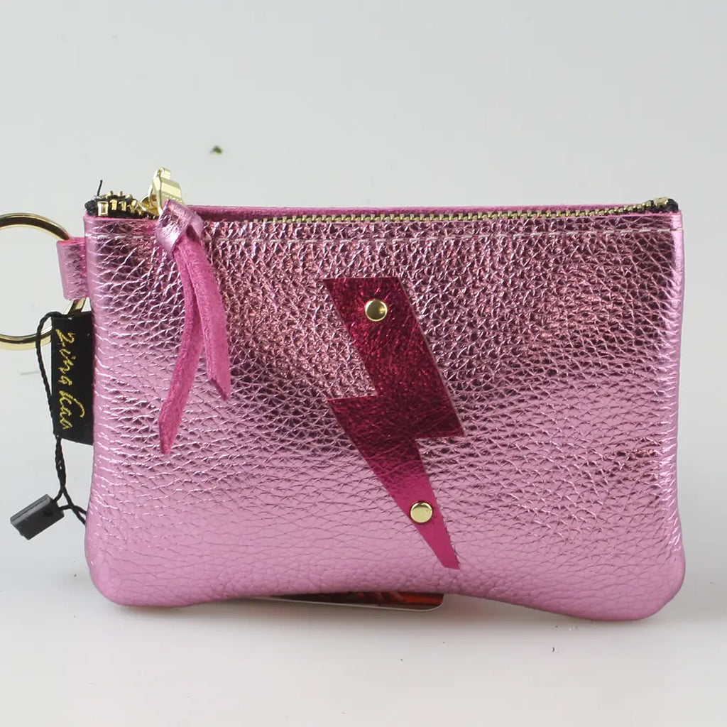 Soft leather zip change purse wallet with a cool lightening bolt applique.