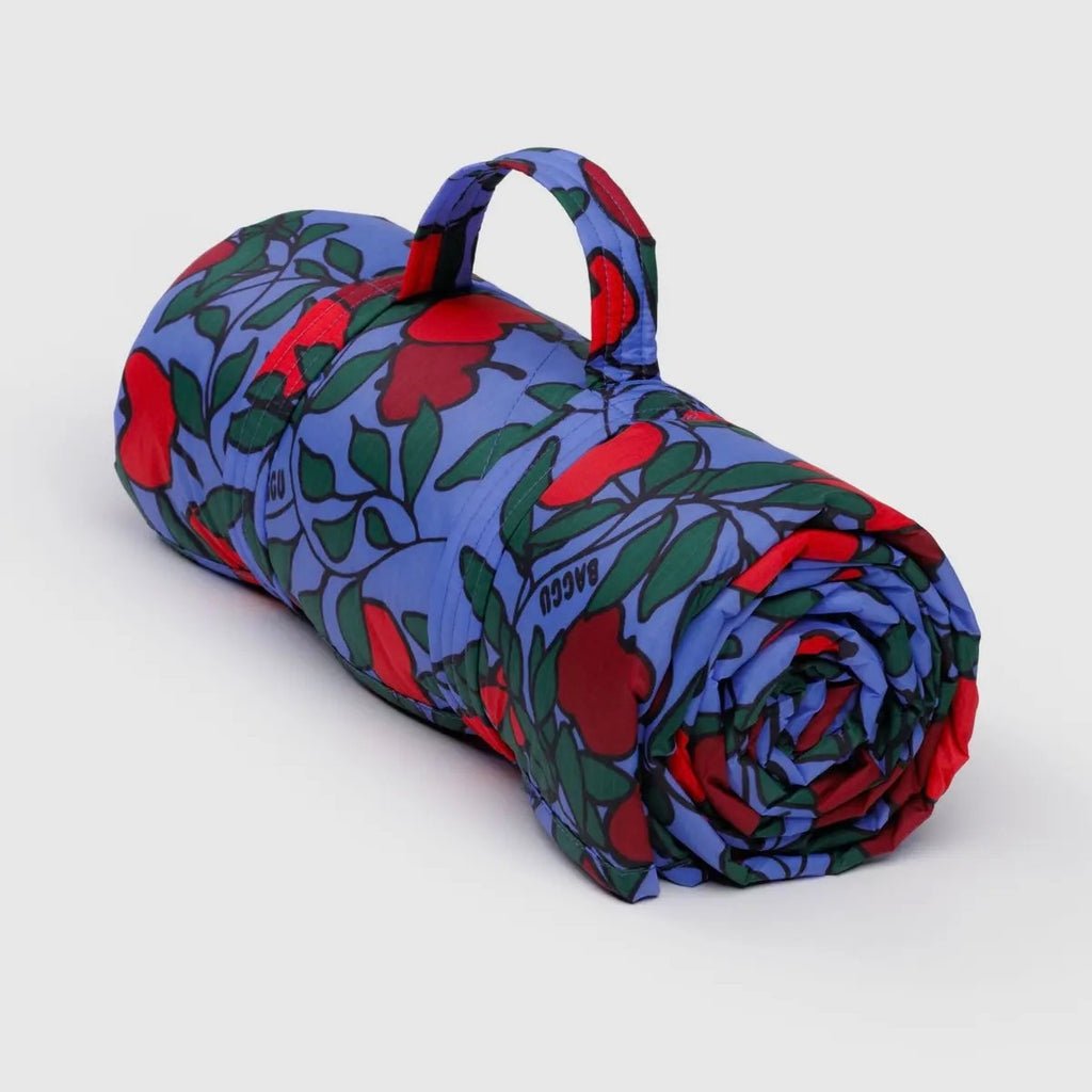 A quilted ripstop picnic blanket with carrying strap so you can roll it up and bring it anywhere.