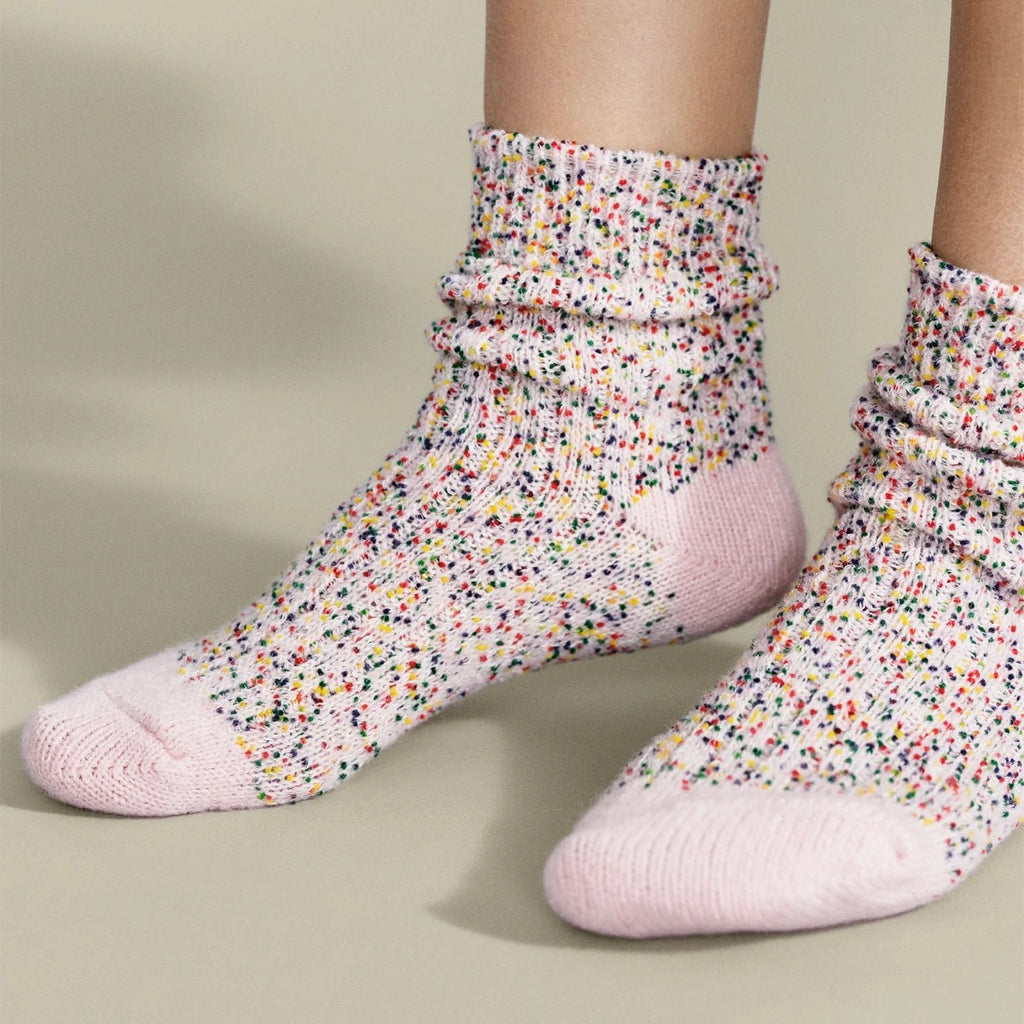 Put on your dancing shoes…and your dancing socks! Colorful confetti yarns adorn these short crew socks making them a perfect boogie woogie pair.