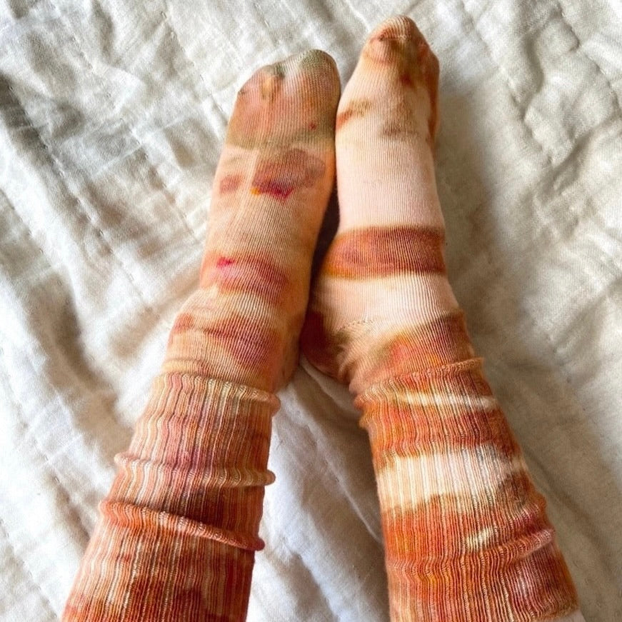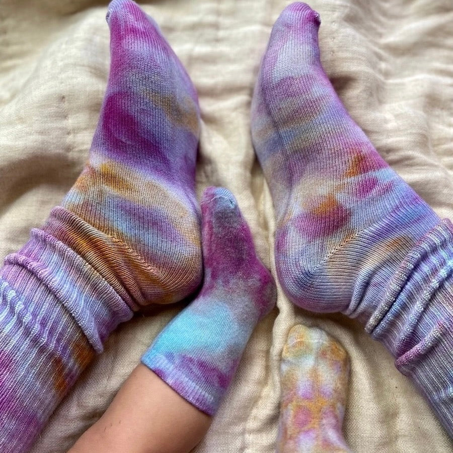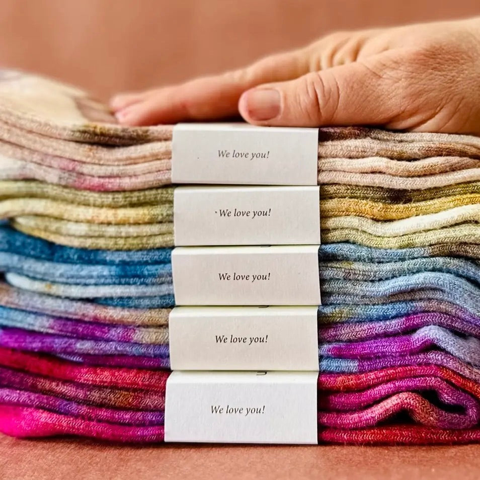 Each pair is uniquely hand-dyed in our backyard studio, where art meets nature. The ever-changing elements—like the day’s temperature or a gentle breeze—add a touch of magic to the process, making every pair truly one of a kind. Experience the perfect blend of comfort, craftsmanship, and individuality.