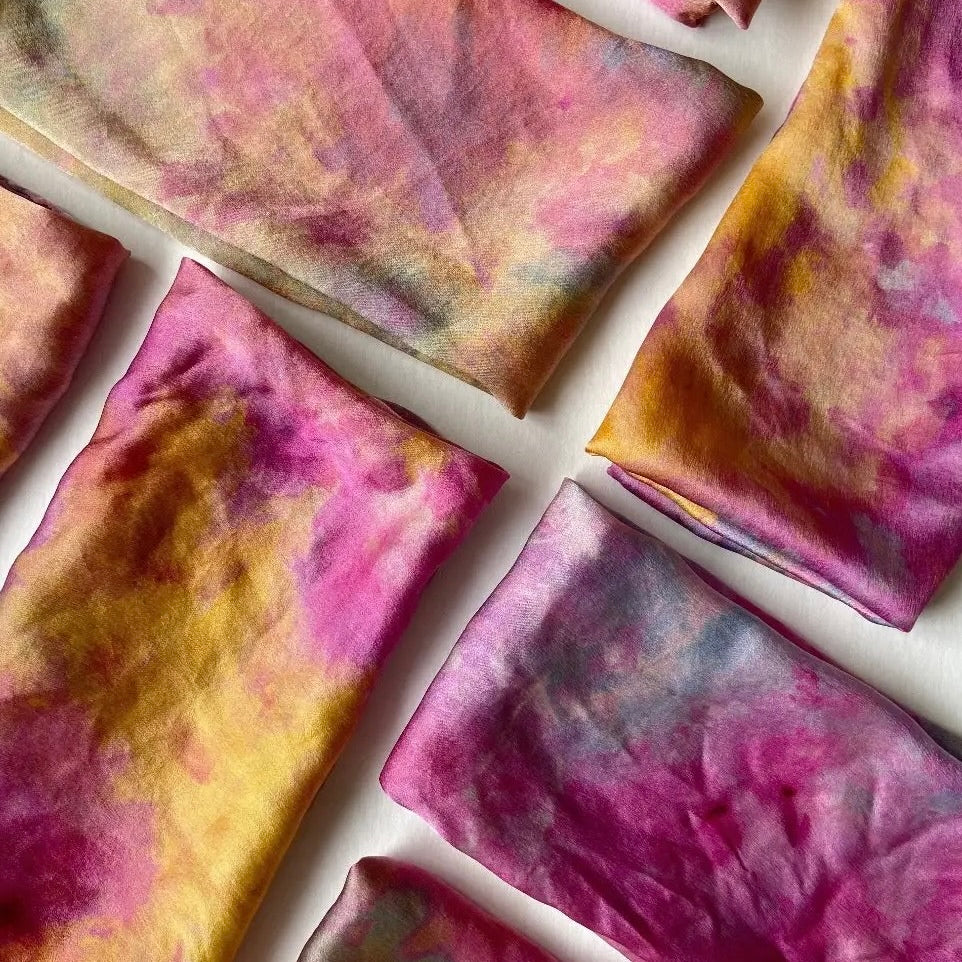 These pieces are dyed by hand in our backyard studio. Every element from the temperature that day, to the way the wind is blowing, affects they way they come out. It's a truly magical and collaborative process.