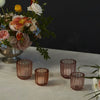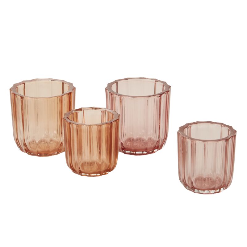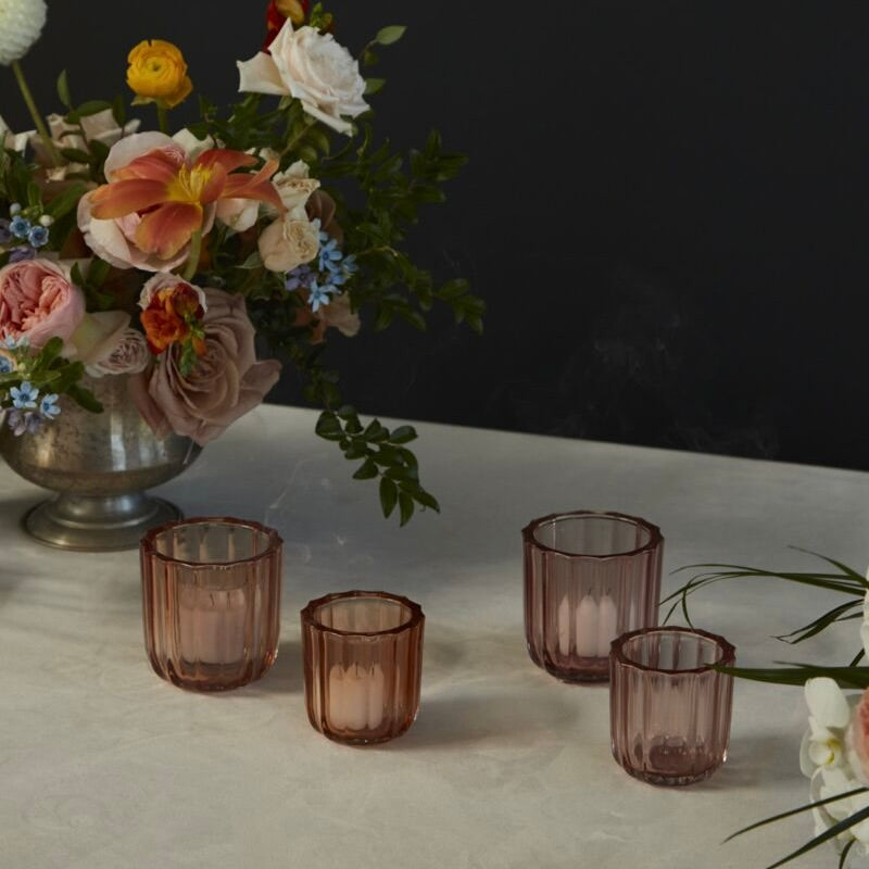 With a trendy, rose-colored hue & ribbed surface design, the thick glass Moroccan  Votive offers a simple elegance that completes a modern tablescape & creates a cozy, fragmented glow when flickering candle light reflects through the surface texture.