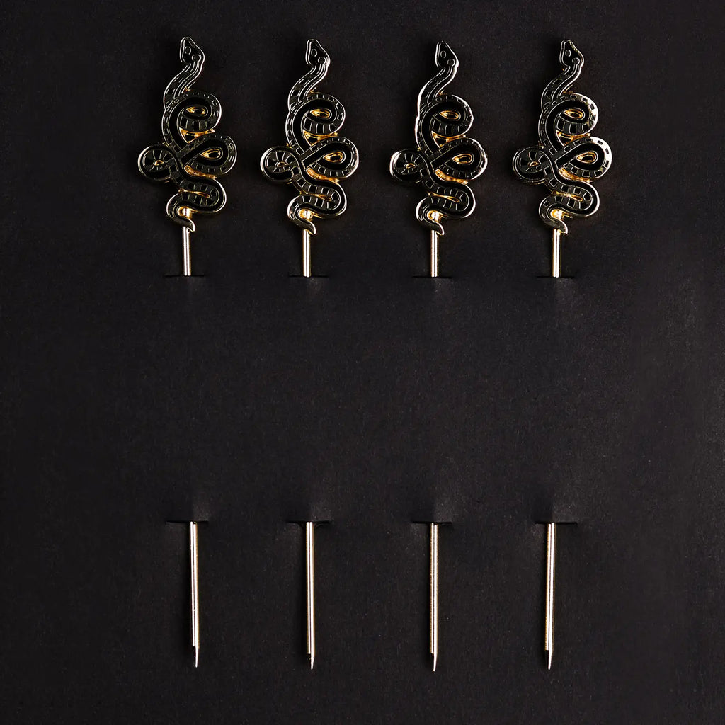 Serpentine swizzlers to gussy up your drinks. An alluring set 4 of cocktail picks adorned with elegantly leaping leopards. Gold picks with black enamel finish, packaged in our custom printed box.