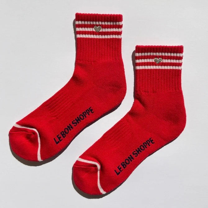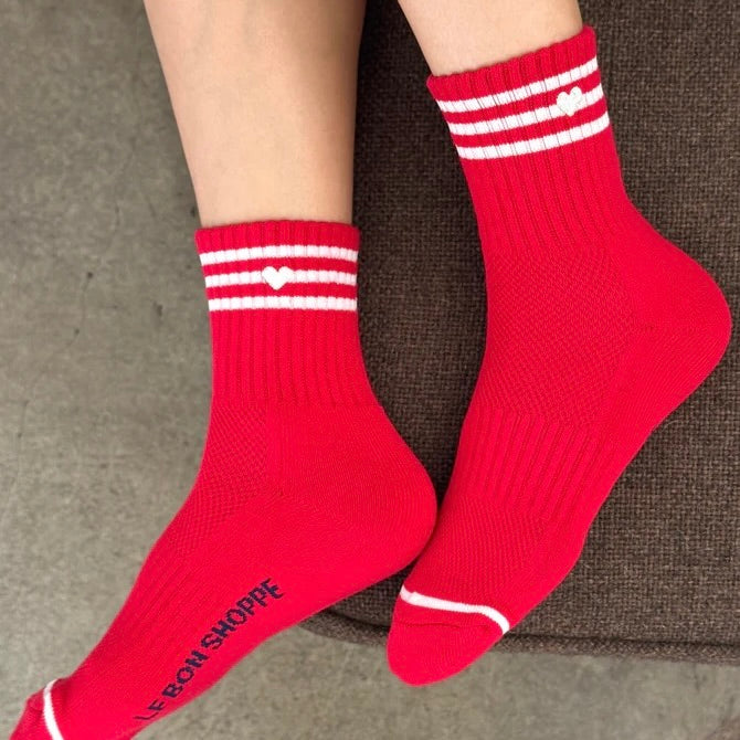 Similar to the Boyfriend Socks, except with a short leg that fits true to the classic crew length. Under the classic triple contrast stripe sits an embroidered heart, adding the sweetest touch of affection to any outfit.