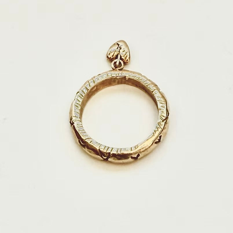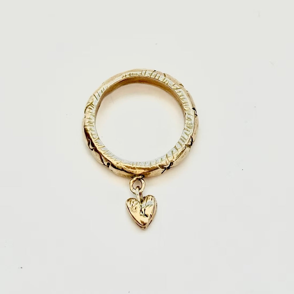 More is a hand carved brass band with stars all around and a tiny brass heart suspended in front.