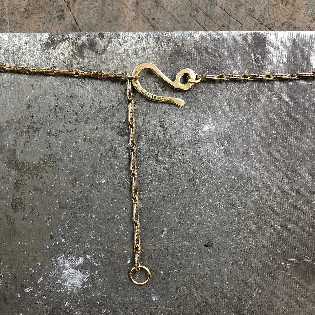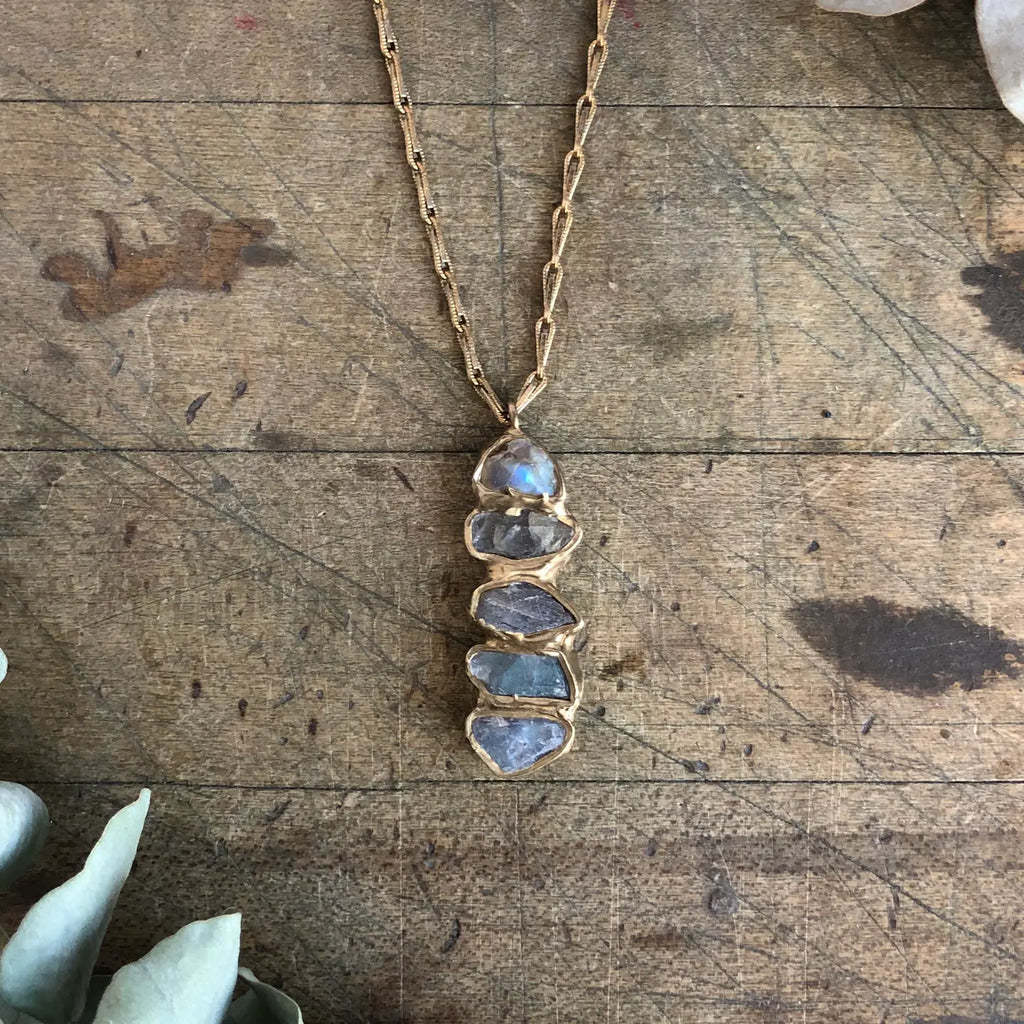 Like a moth to a flame, the flash inside labradorite is truly mesmerizing. Labradorite are embedded in brass and anchored on our signature brass chain with a handmade clasp.