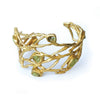 Green garnet are embedded in nickel free brass to create this sculptural cuff. Slightly adjustable by gently squeezing the metal.