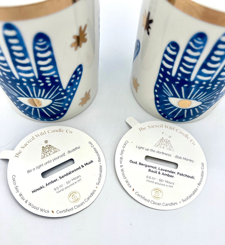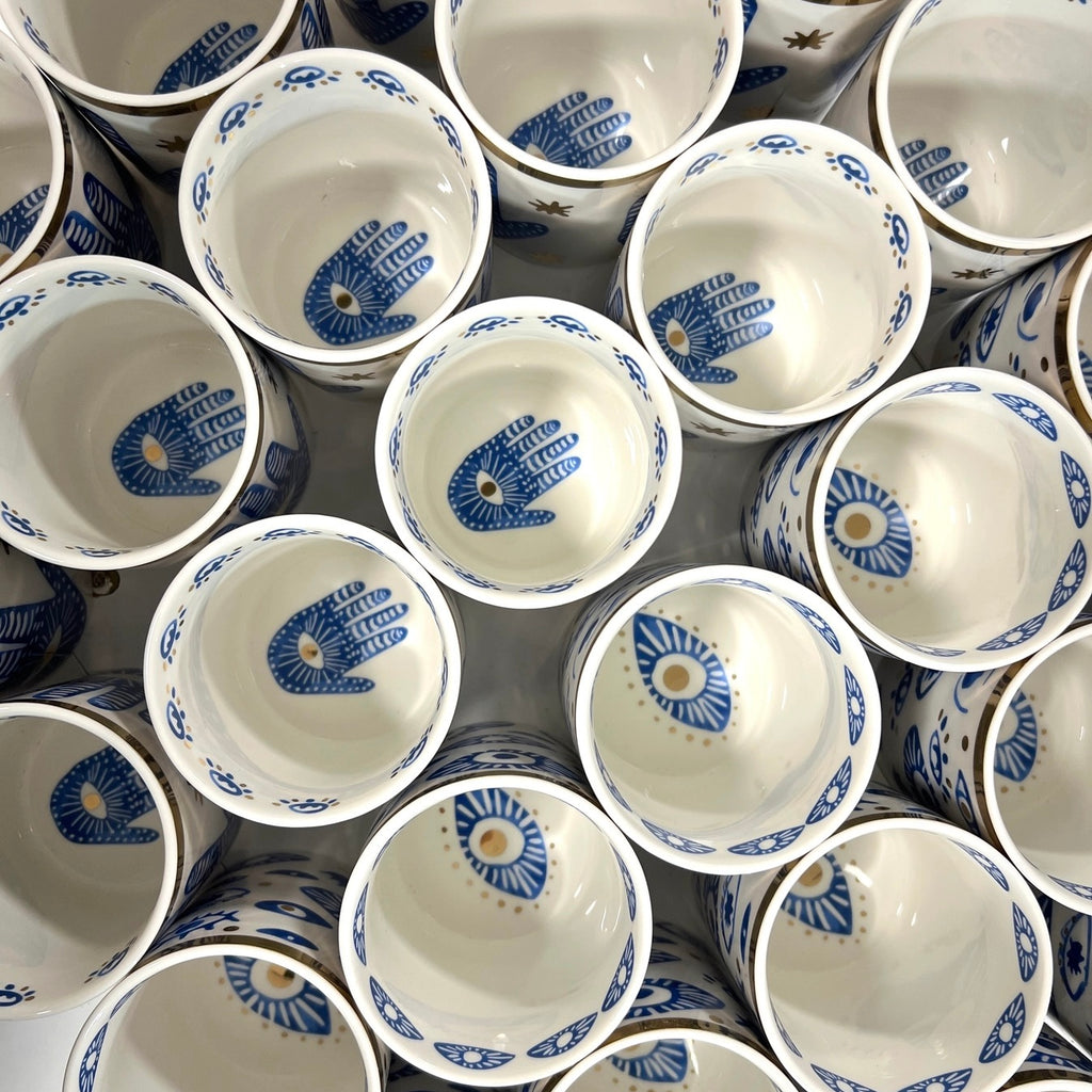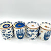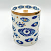 Hamsa & Evil Eye Gold, Blue, and White Ceramic Candles