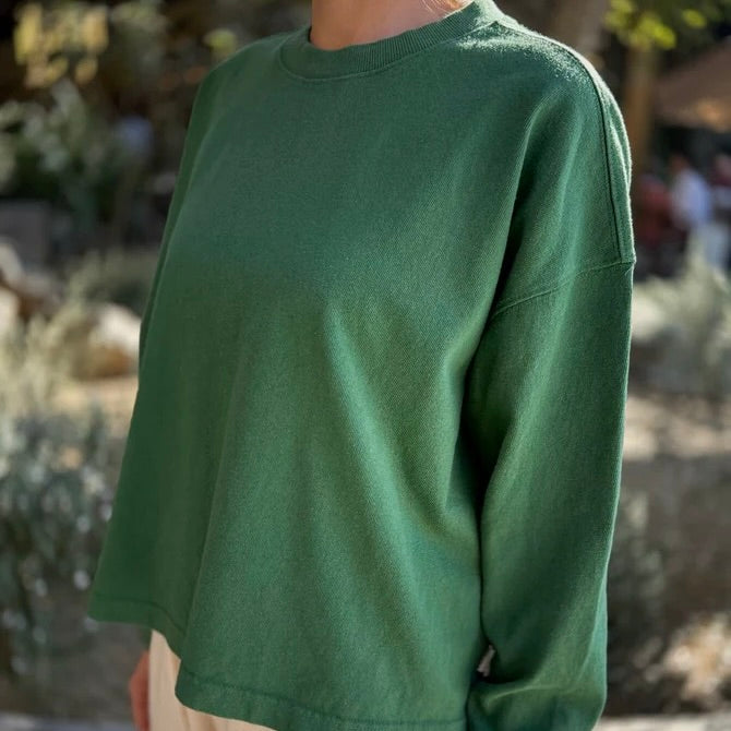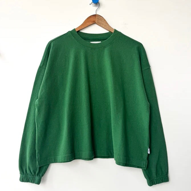 topWe dreamed this beauty up while searching high and low for a simple long sleeve with a feminine touch. This essential long sleeve tee is made in a gorgeous 100% heavyweight cotton fabric. Super raw textured yet soft and airy! Elastic ruched sleeve opening creates a slight balloon sleeve effect worn down and scrunches up beautifully. This tee is garment dyed and pre-washed for a rich textured look.