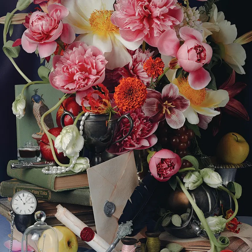 Inspired by the opulent still lifes of Clara Peeters, this richly layered tribute to fairytales and storytelling brims with bursting florals, wax-sealed letters, and easter eggs from the book.