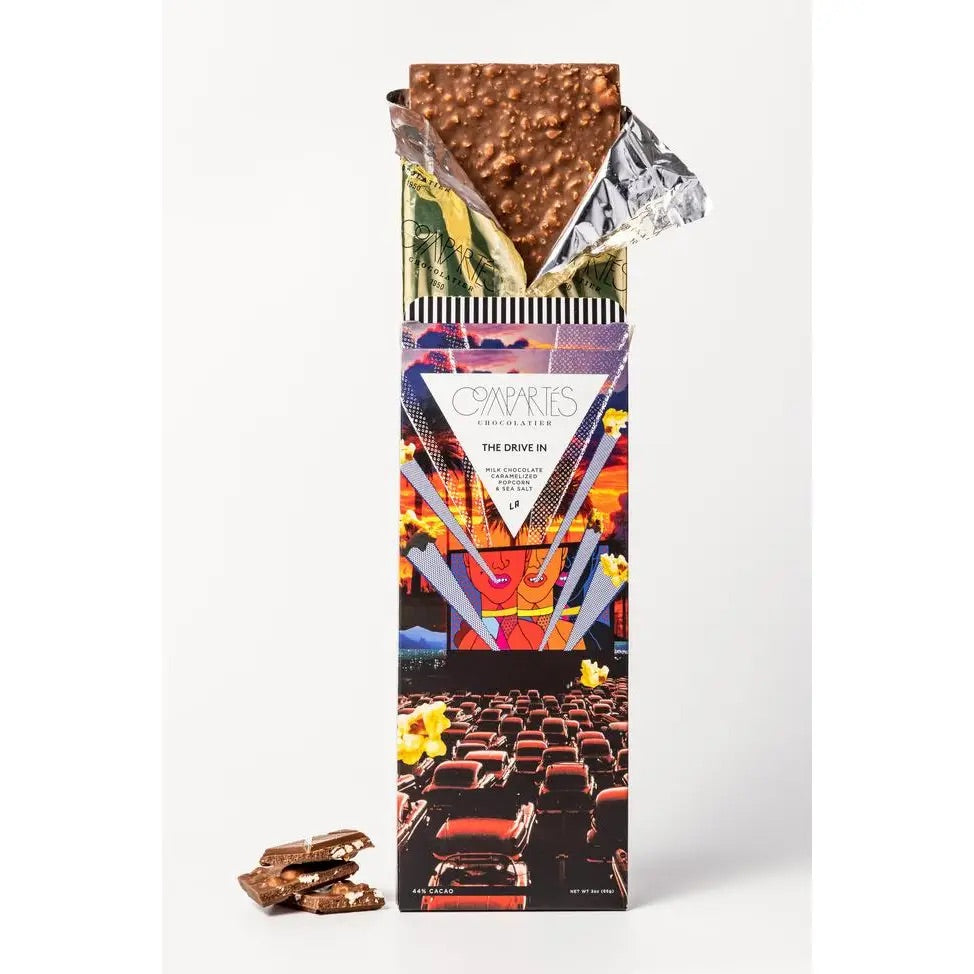 Compartés gourmet milk chocolate and popcorn Drive In bar takes you to the movie theatre with just one bite. Made with our traditional candy corn, kettle corn and caramelized movie popcorn all crunched up and drenched in our signature milk chocolate. If you go to the movie theatre and mix your chocolate with your popcorn, this chocolate bar is for you! Features a drive-in movie theatre mixed with Los Angeles Hollywood iconic on the packaging. Handmade in our Los Angeles chocolate kitchens.